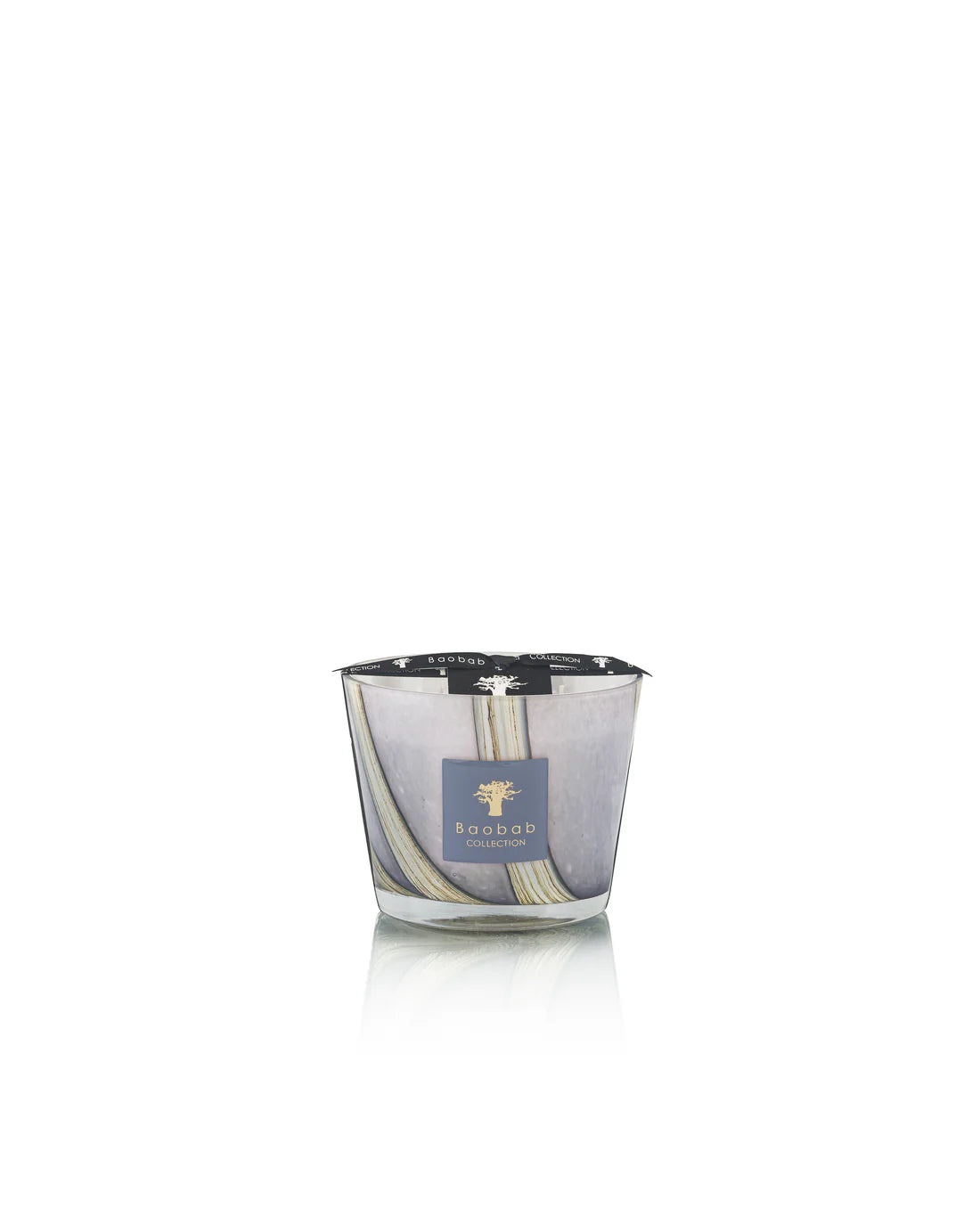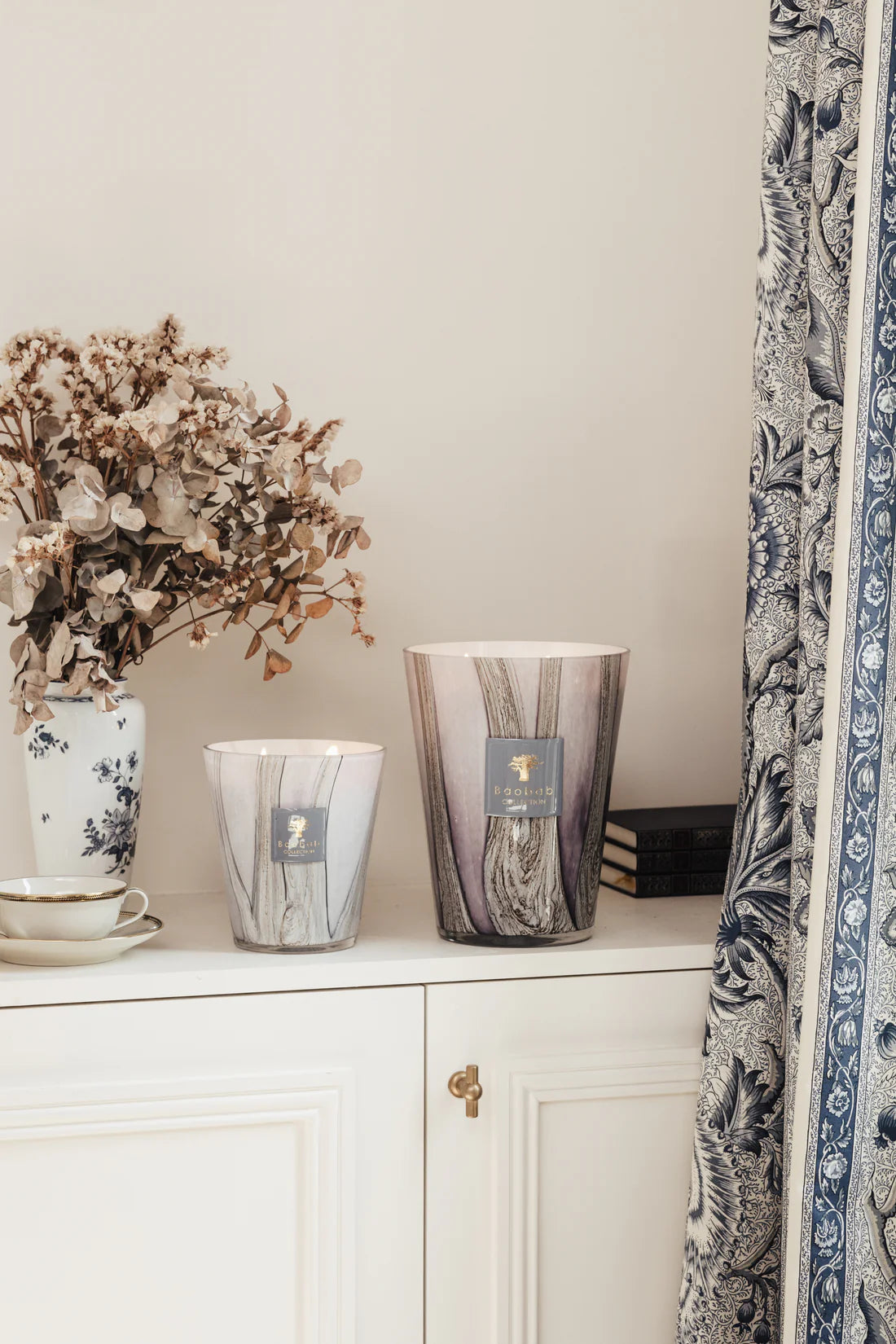 O vidro da vela perfumada Brocéliande, com suas linhas verticais que evocam a madeira da floresta, oscila de maneira sutil entre o cinza e o lavanda, revelando um requinte generoso.