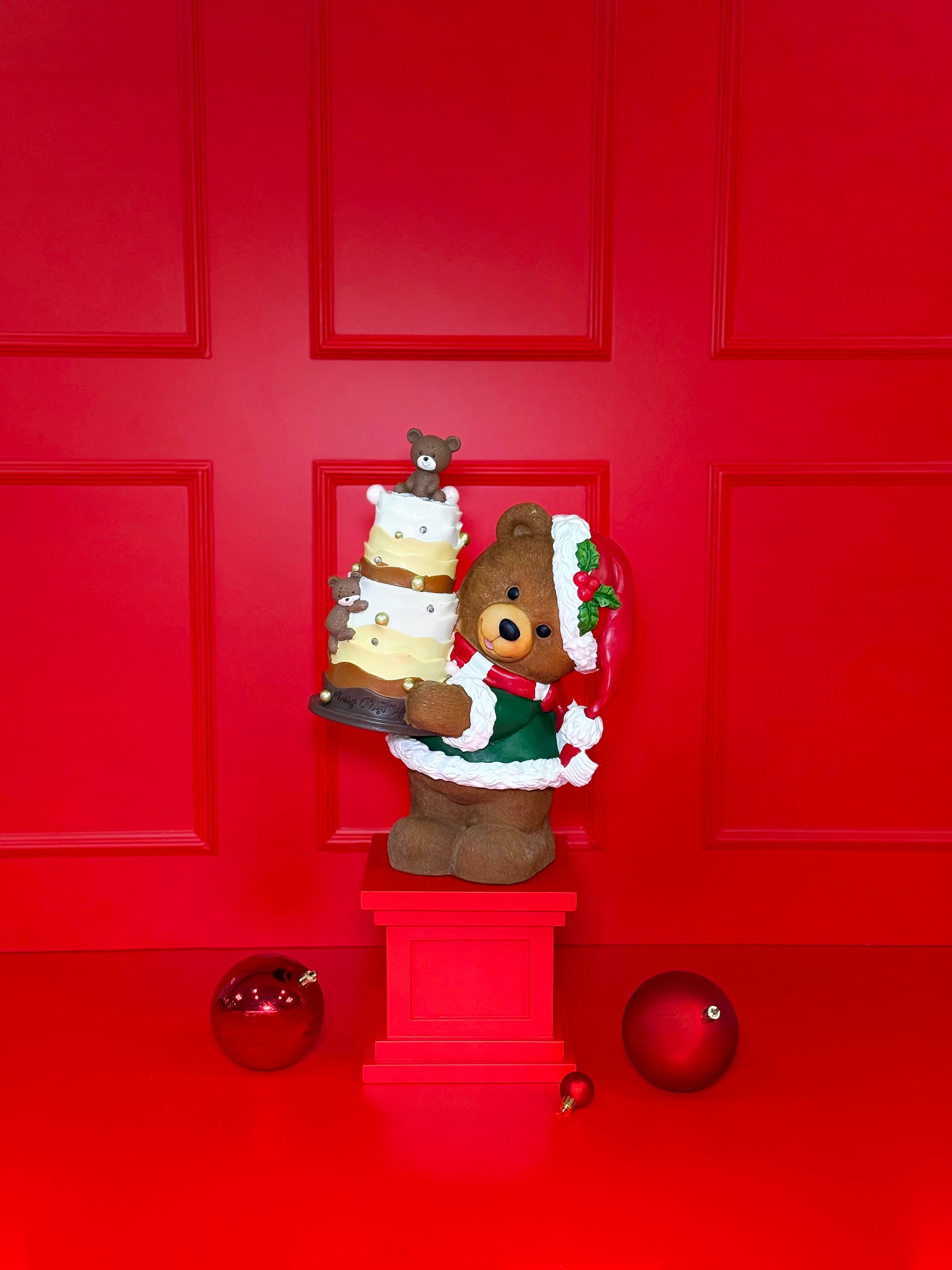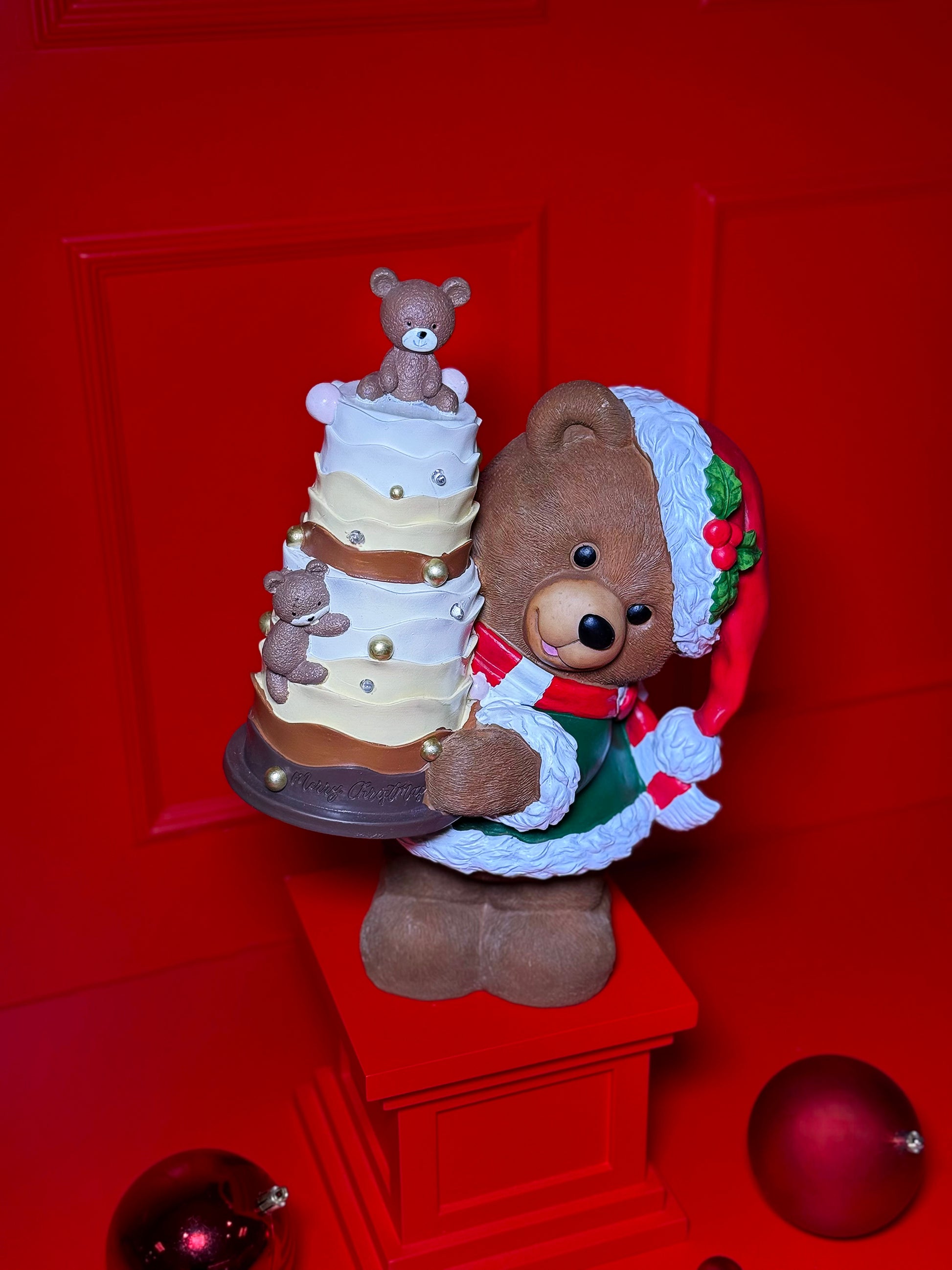 Esta peça decorativa traz o encanto refinado do Natal nova-iorquino, onde tradição e sofisticação se encontram em perfeita harmonia. O delicado urso, trajando um elegante manto verde e gorro com detalhes de azevinho, sustenta um magnífico bolo em tons dourados e marfim, iluminado por pequenas luzes que remetem ao festivo e acolhedor. Cada detalhe remete à elegância das vitrines natalinas da Quinta Avenida, transformando o ambiente em um cenário de magia e celebração.