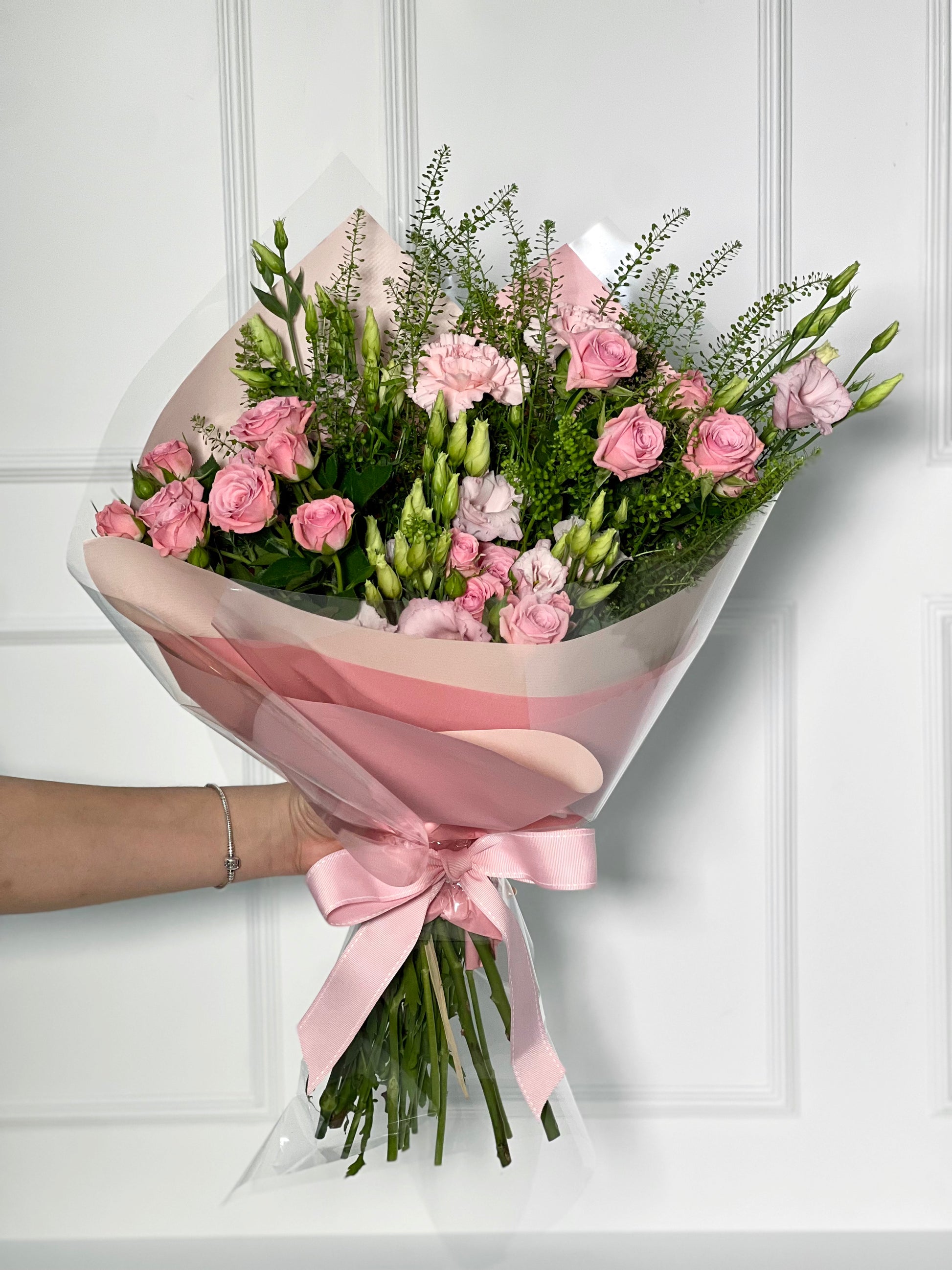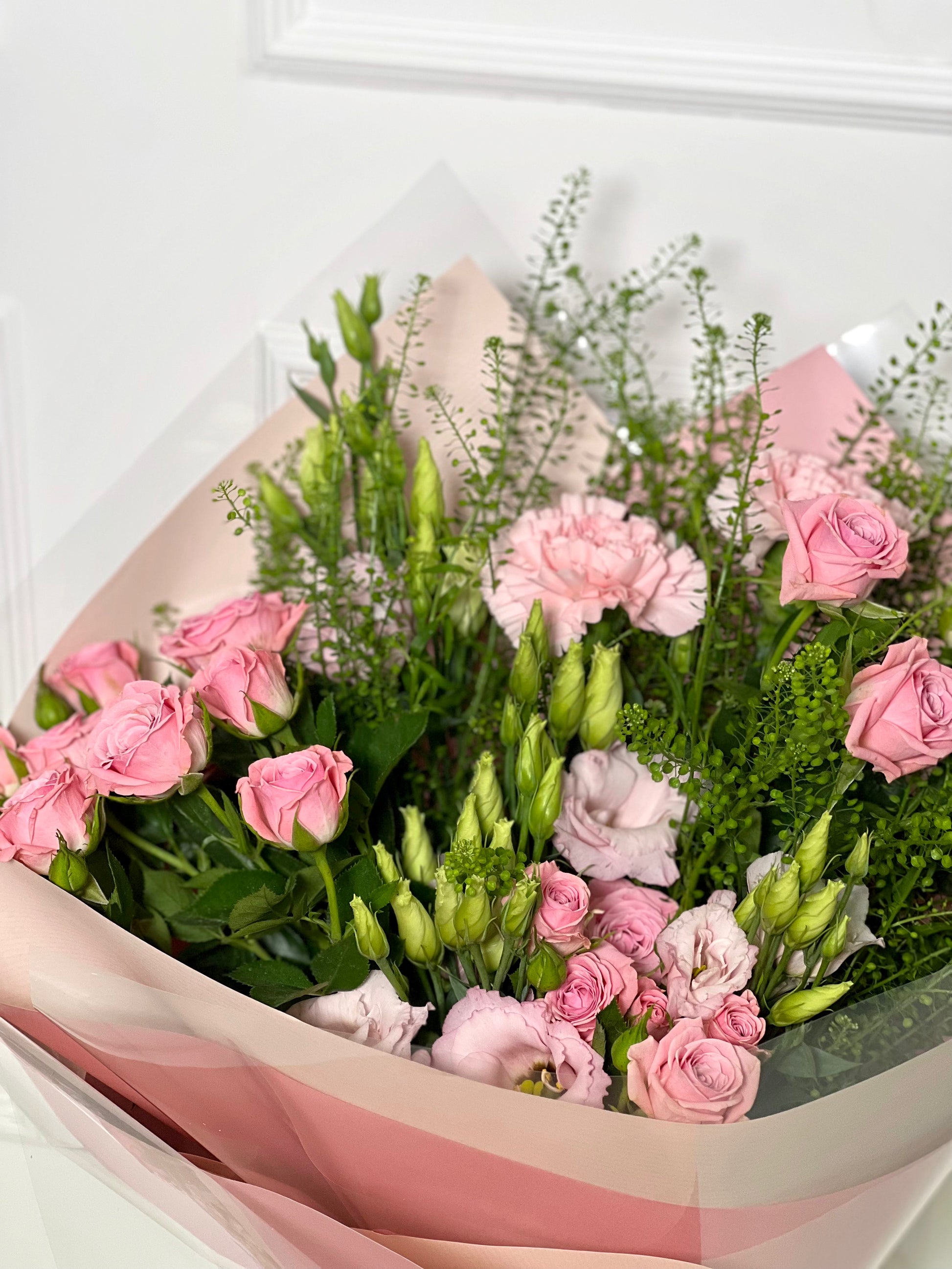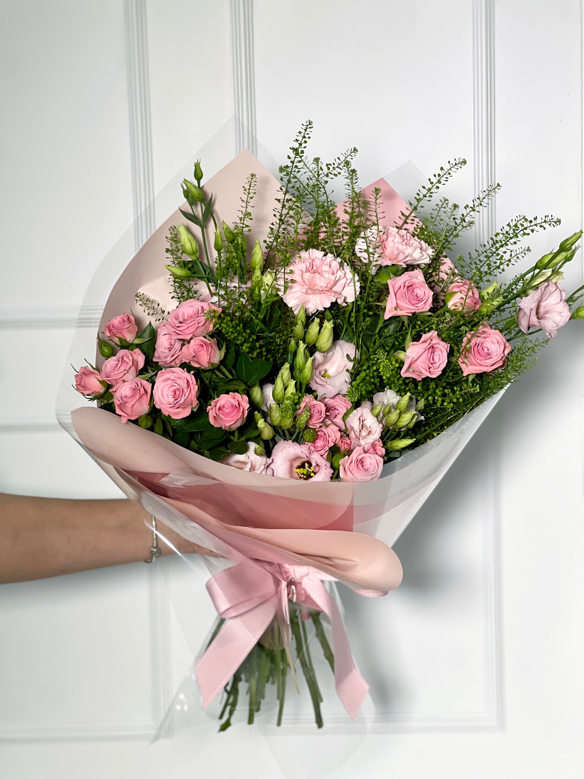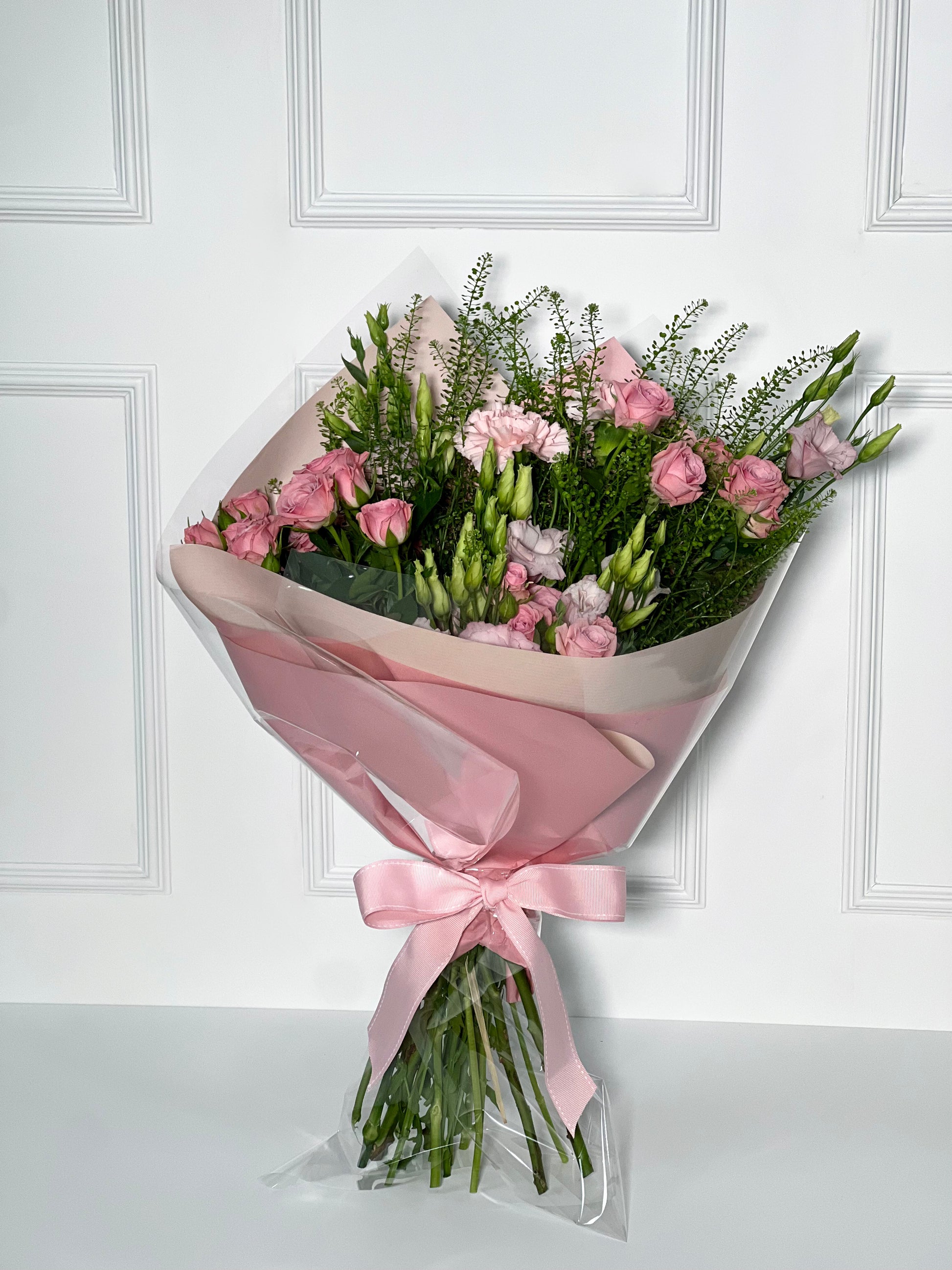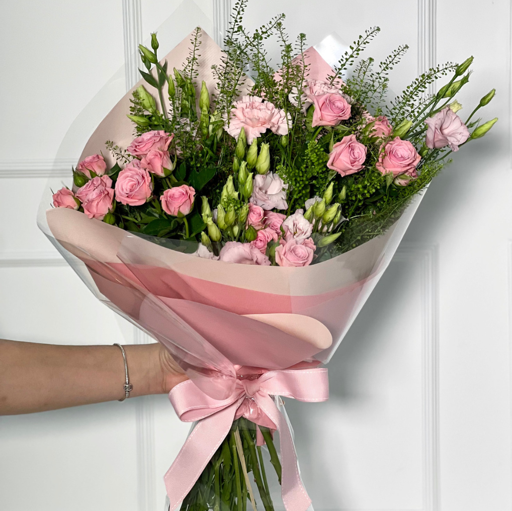 E dentro dele, temos o nosso bouquet Dominique, campestre e com essa variedade de formas e tamanhos dá todo um ar do campo e sutileza a esse arranjo, composto por rosas ramificadas, lisianthus, green bell e cravos cor de rosa, com essa papelaria toda em pink, perfeito para presentear a sua amada(o)!