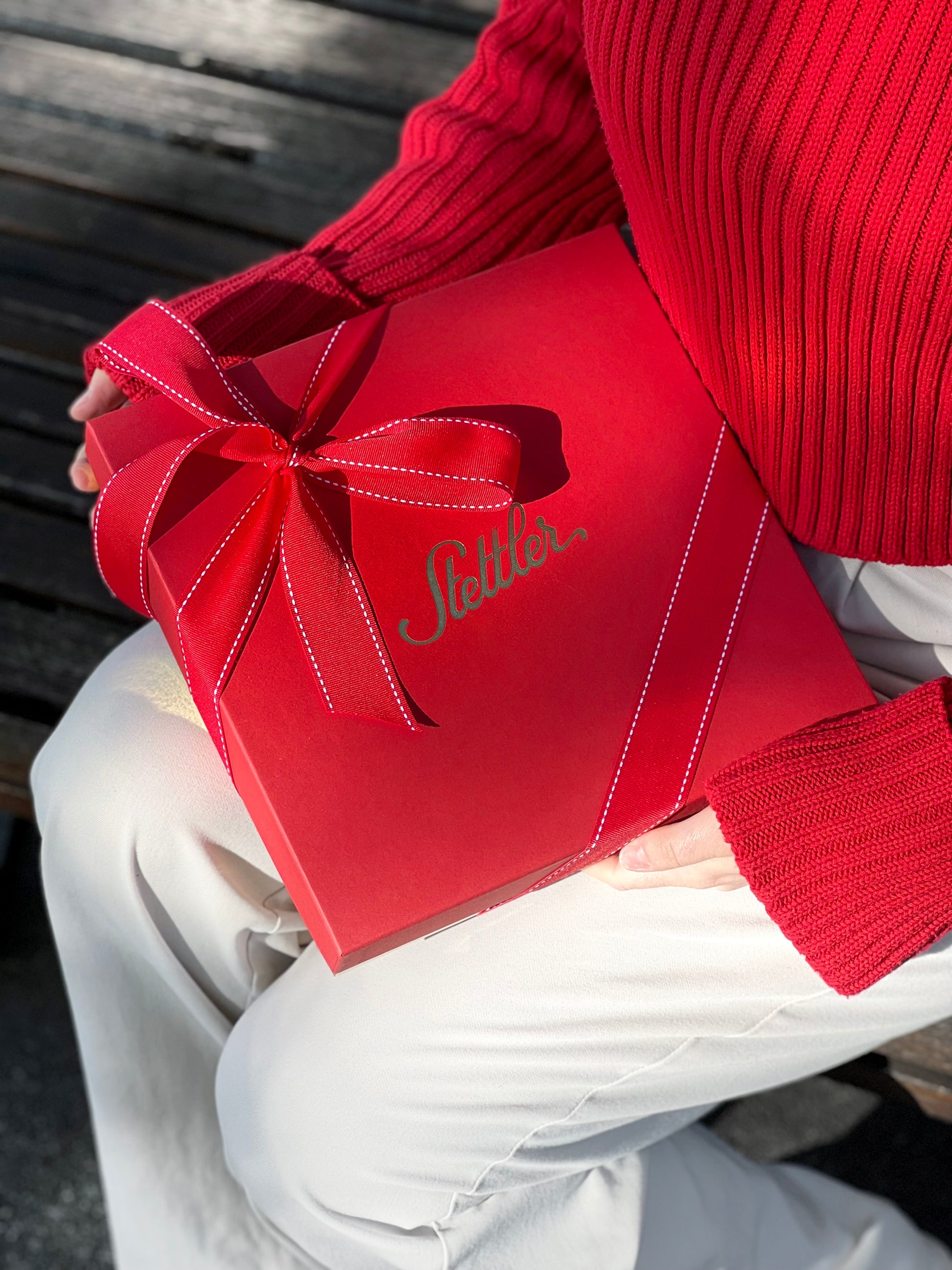 Presenteie-se ou surpreenda alguém especial com a sofisticação e o sabor irresistível dos chocolates Stettler. Esta elegante caixa vermelha, adornada com um laço refinado, traz consigo a excelência da tradicional chocolataria suíça, conhecida por sua qualidade artesanal e ingredientes selecionados.
