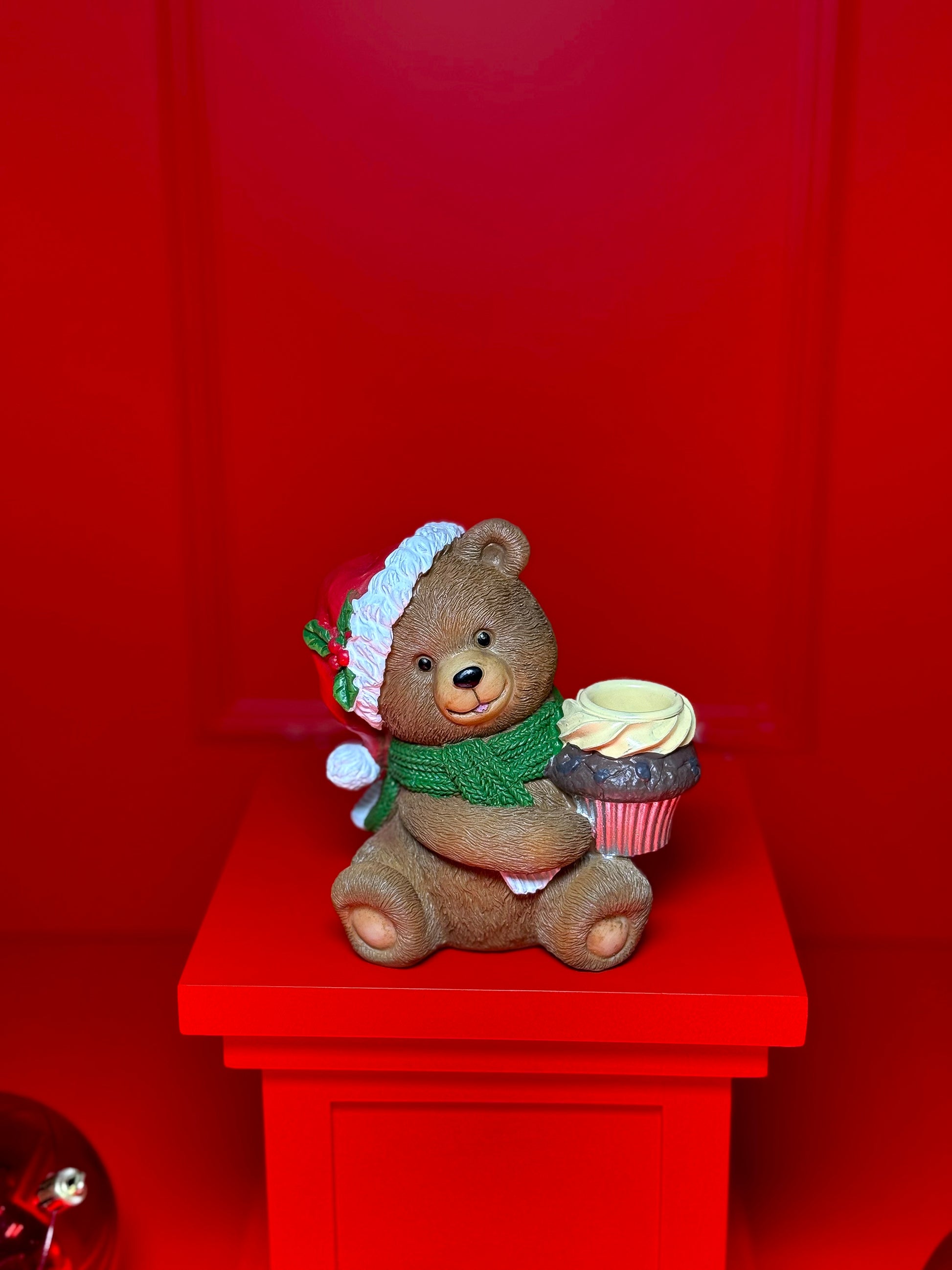 Vestido com um traje natalino vermelho e branco, segura um candelabro em formato de cupcake, pronto para receber uma vela e iluminar seus momentos com charme e aconchego. Cada traço, textura e cor foi cuidadosamente trabalhado para transmitir alegria e o espírito mágico do Natal.