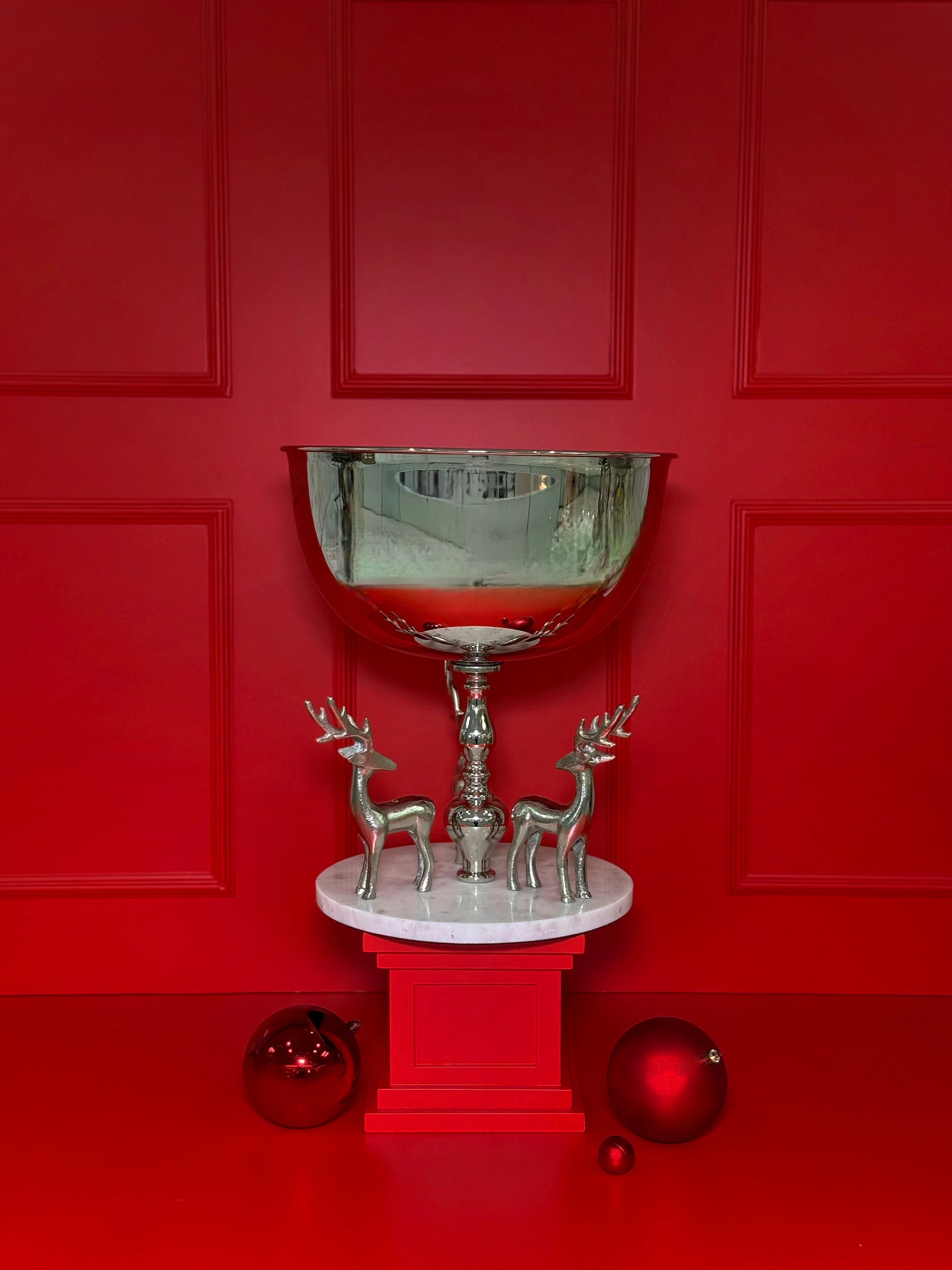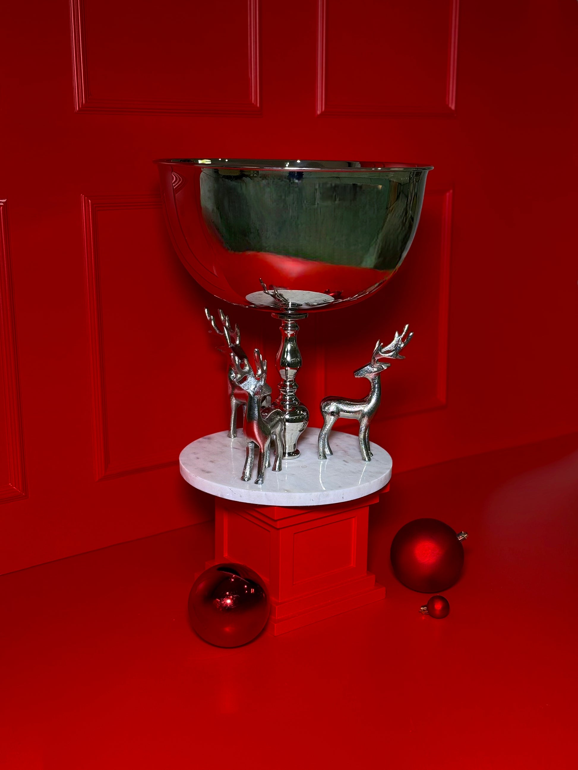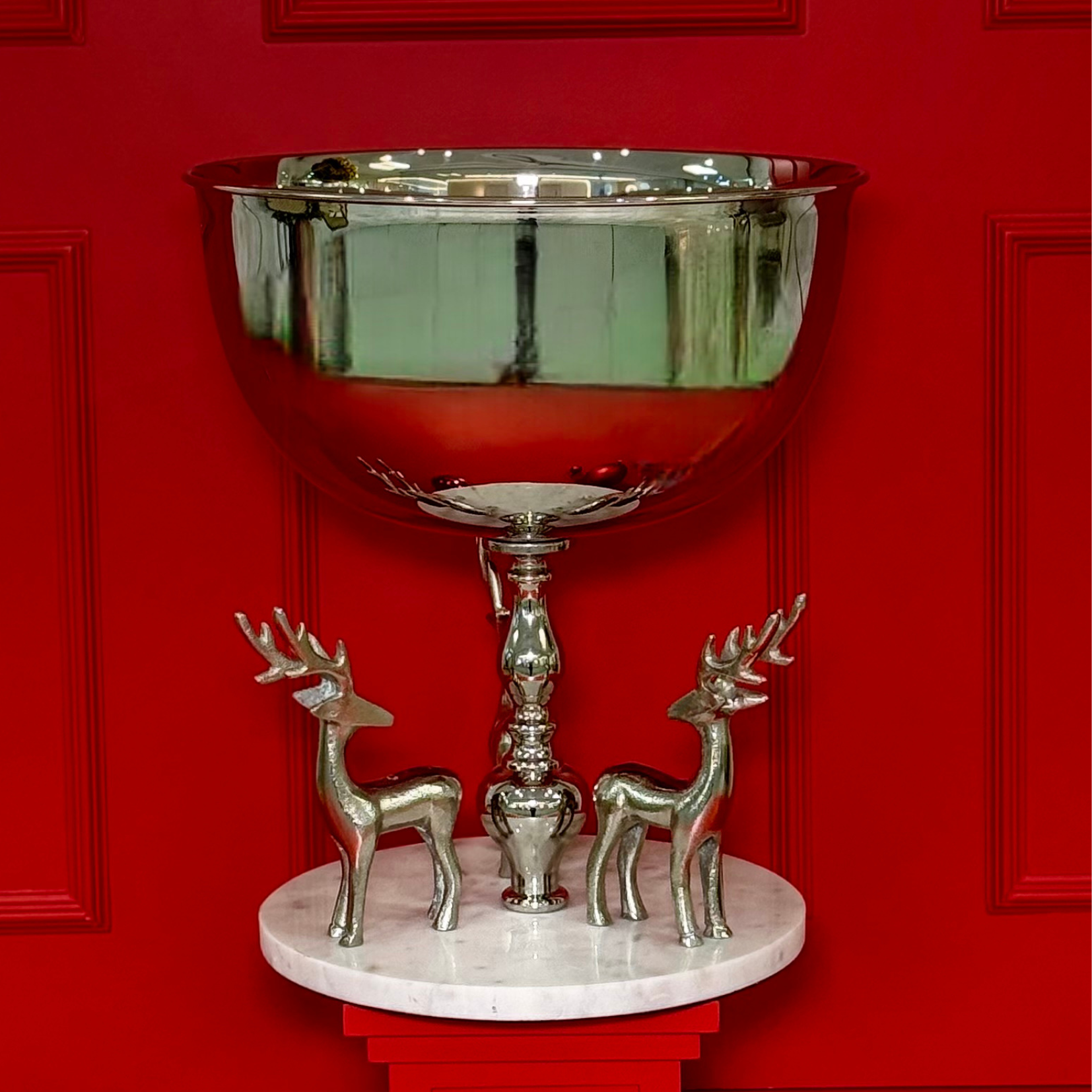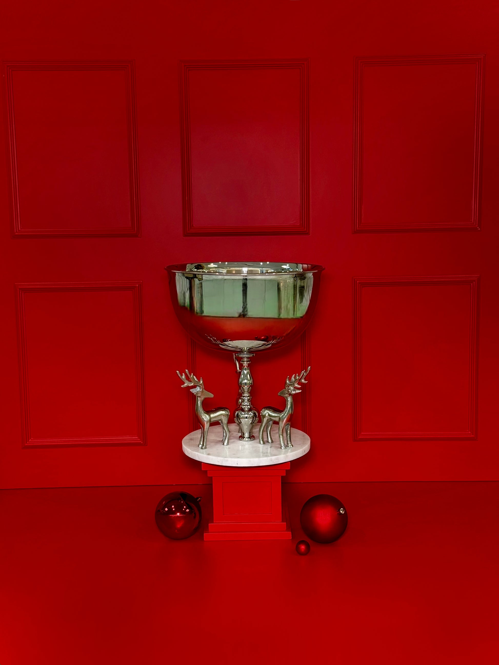 Com acabamento impecável e brilho espelhado, esta champanheira é sustentada por uma base ornamentada e acompanhada por duas figuras de veados estilizados, símbolos clássicos da magia e da tradição natalina. O contraste entre o metal prateado e o cenário festivo transforma esta peça em um verdadeiro destaque na sua decoração de fim de ano.