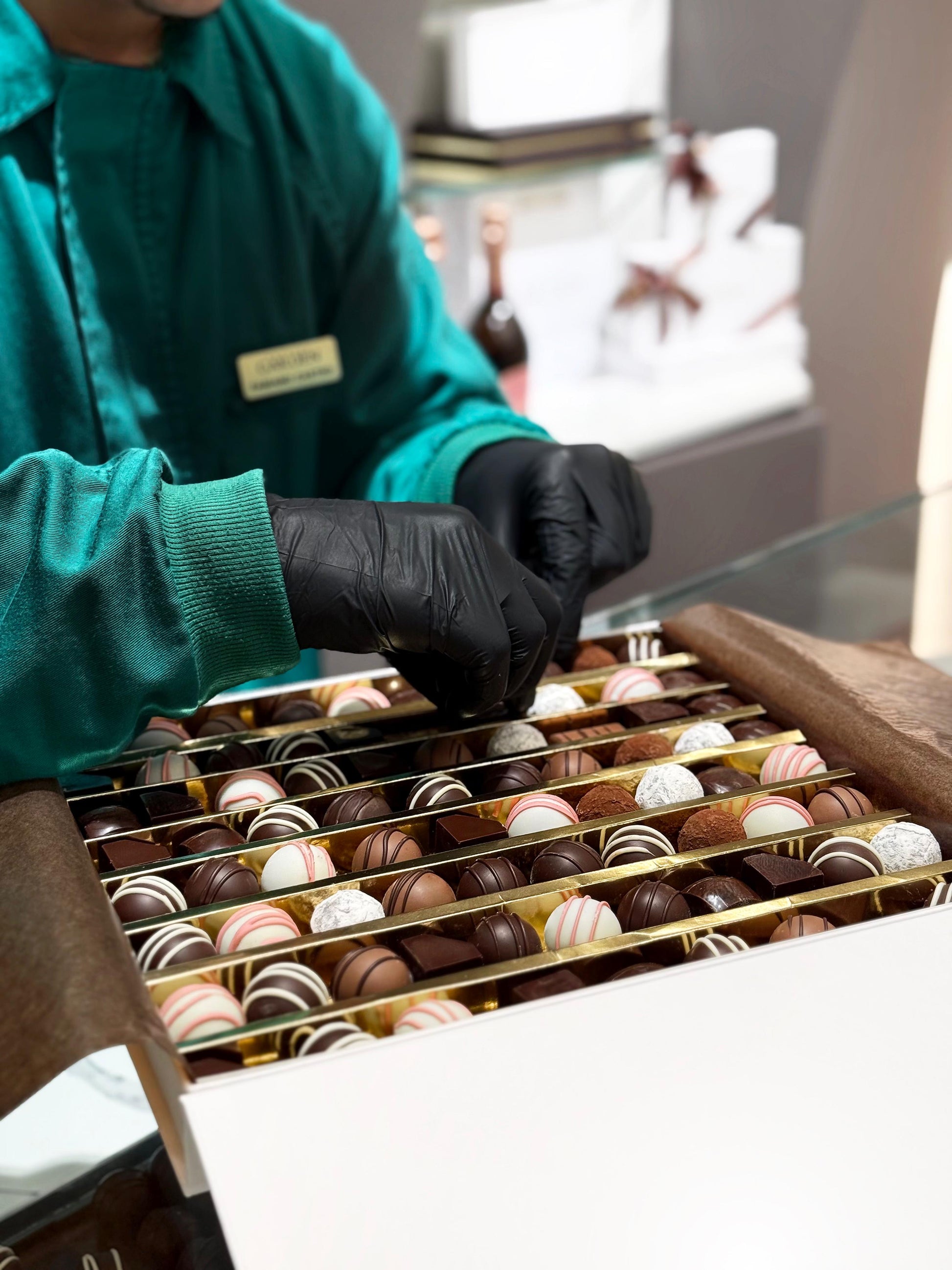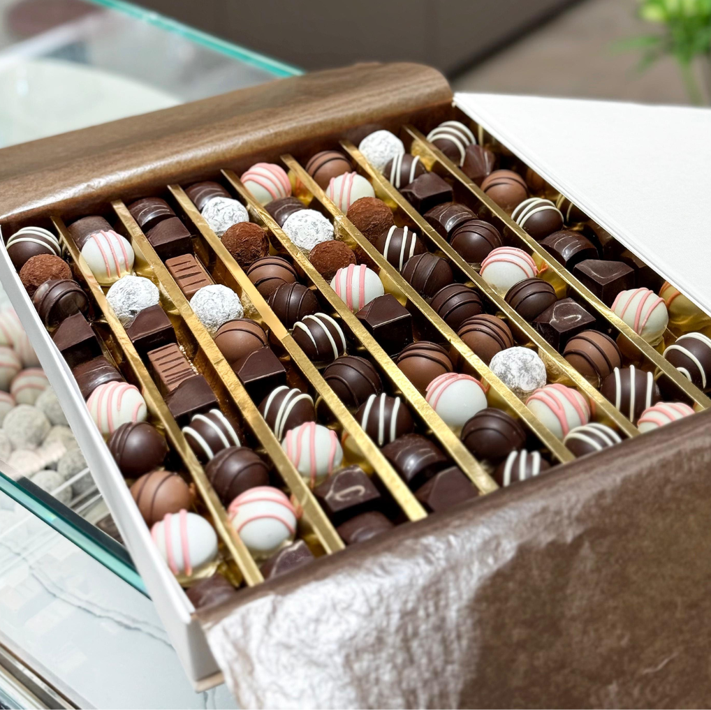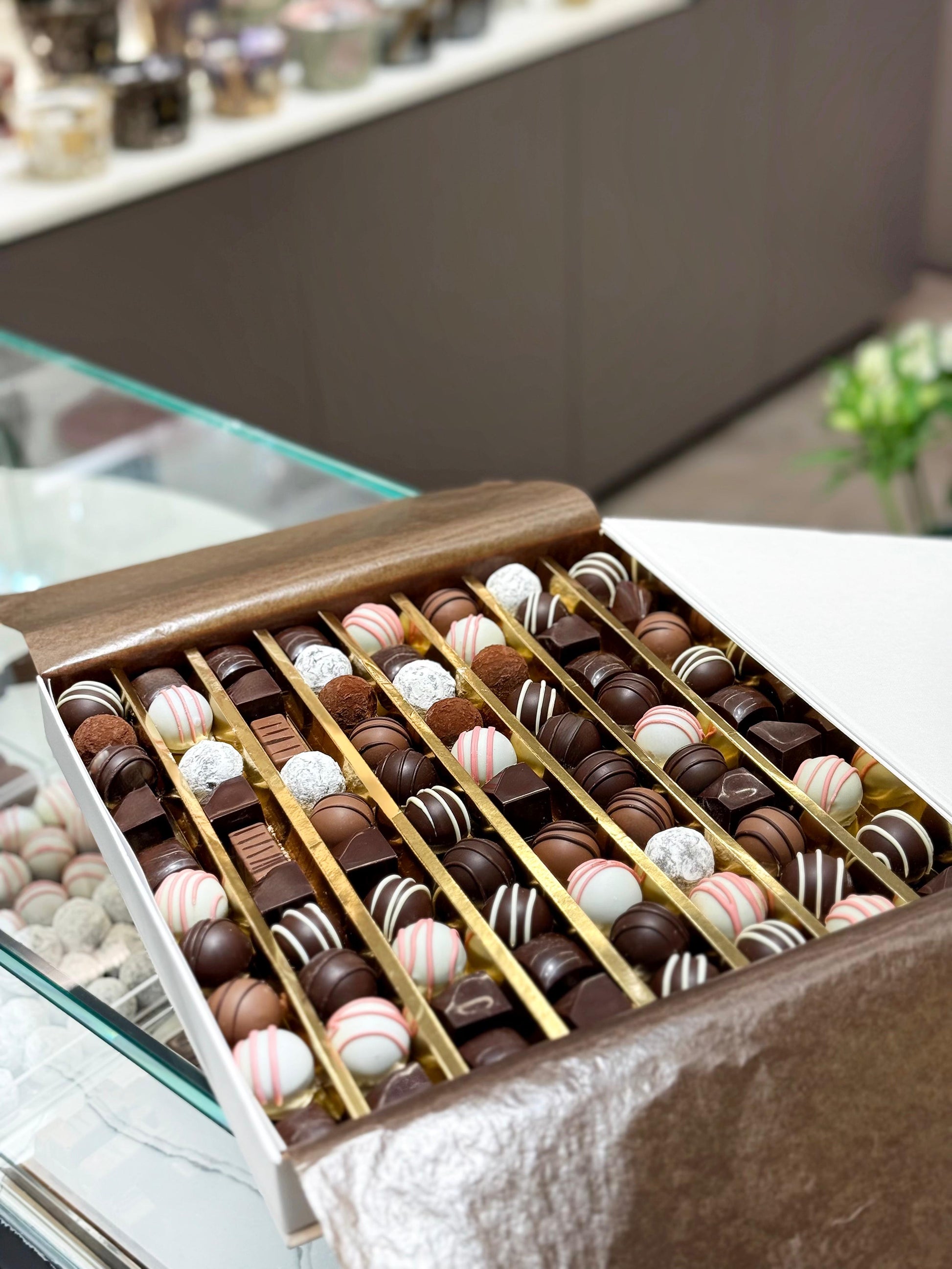Delicada seleção de chocolates, ganaches e bombons. Receitas originais que revelam os aromas do chocolate. Uma caixa ideal para oferecer ou degustar.