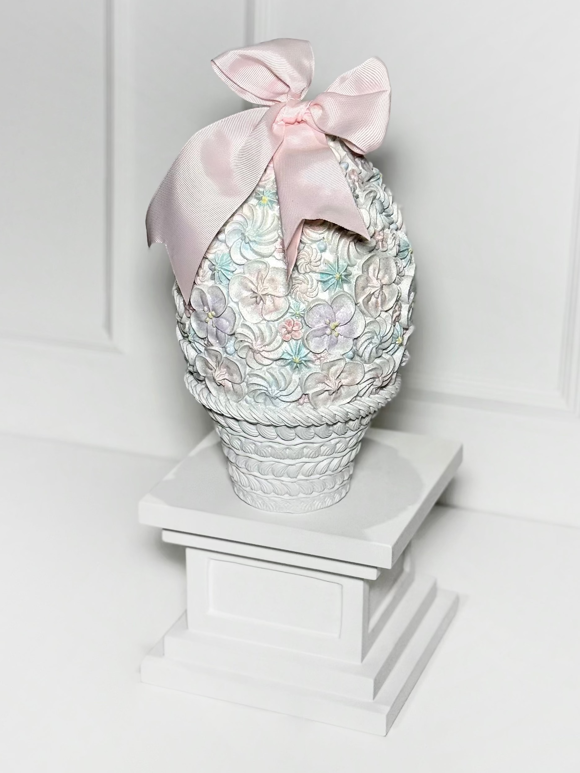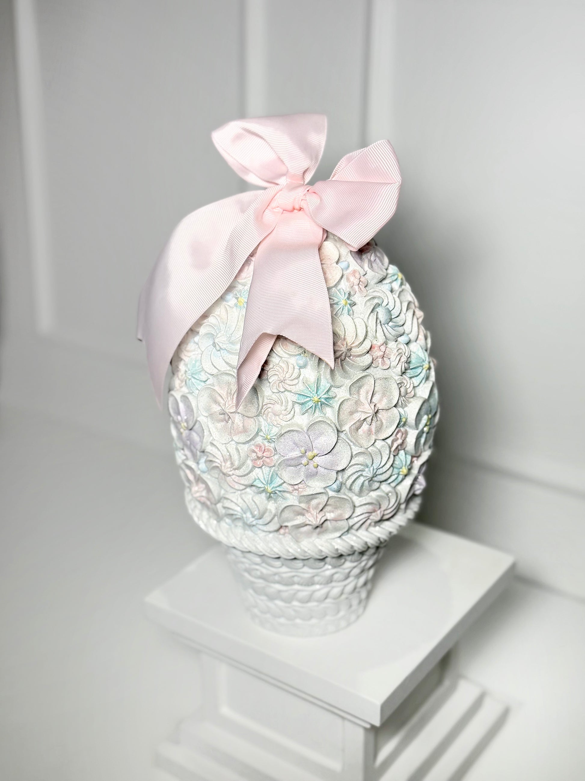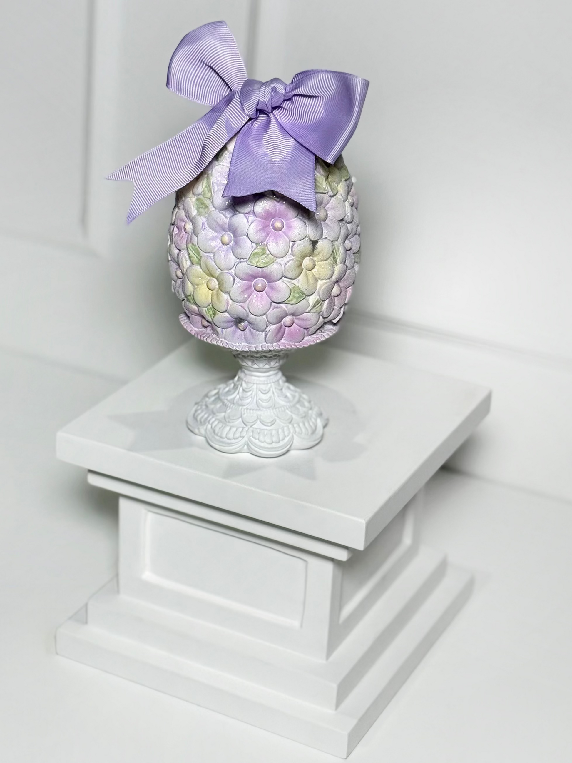 Delicado como a primavera e encantador em cada detalhe, este Ovo Decorativo Floral é uma peça que traduz suavidade e elegância em forma de arte. Revestido por pequenas flores em tons pastel e finalizado com um laço em lilás, ele transmite leveza, romantismo e um charme atemporal.