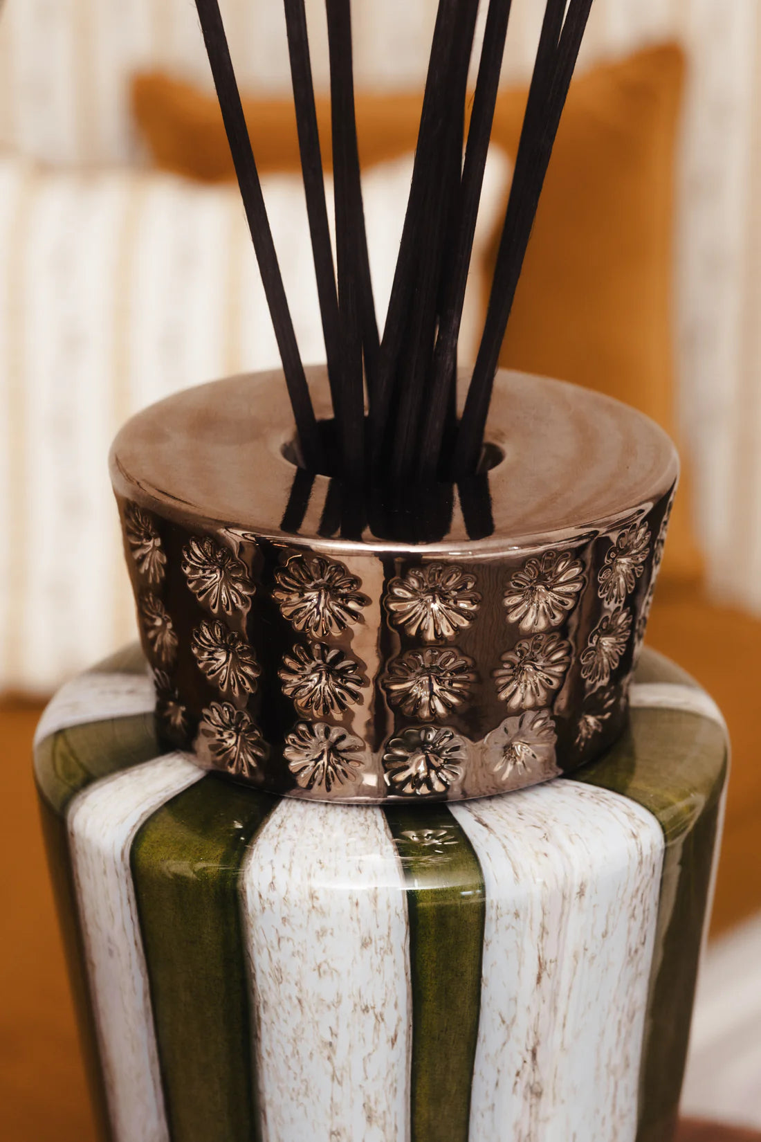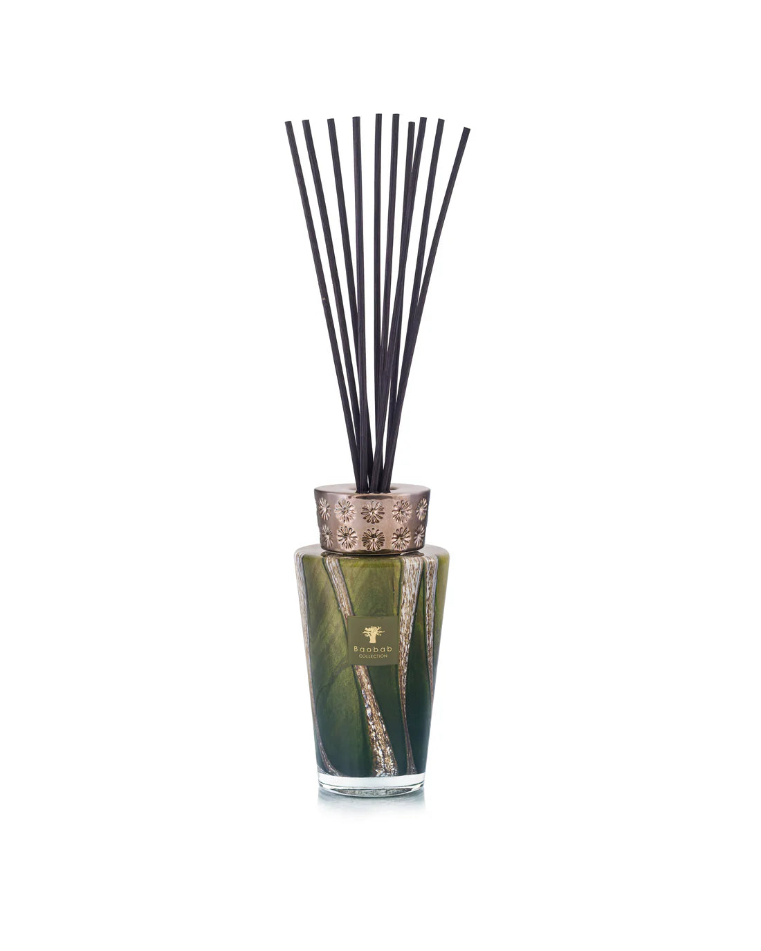 Os difusores da fragrância Sherwood são decorados com linhas verticais que lembram os majestosos troncos de árvores que se erguem em direção ao céu.