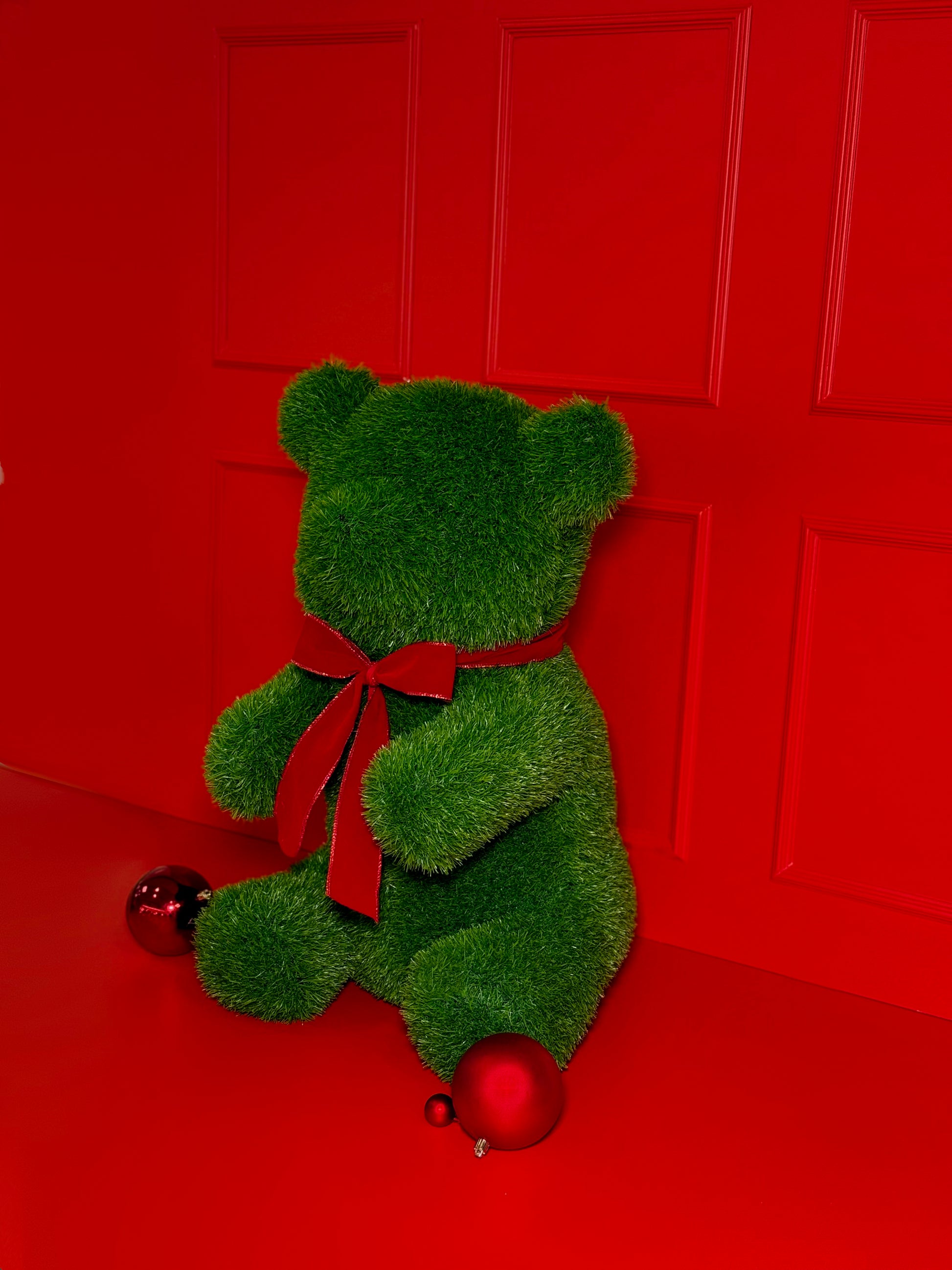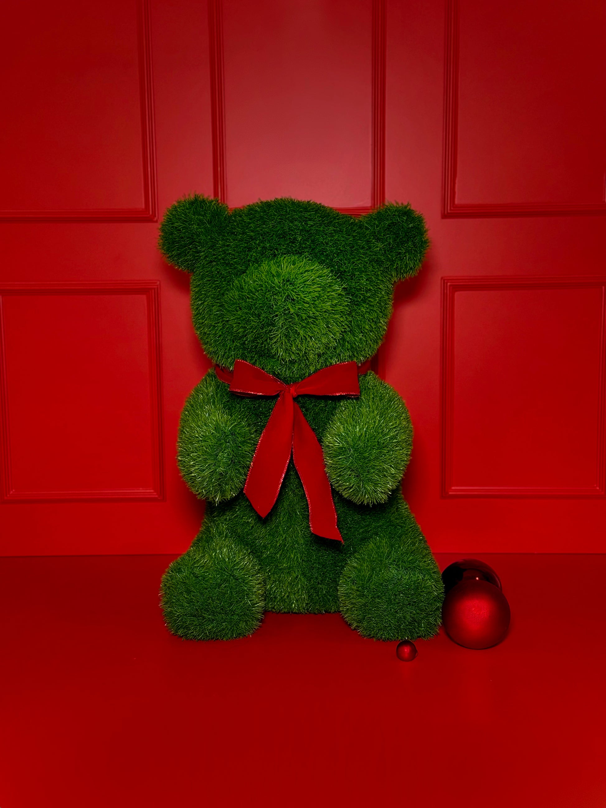 O destaque fica por conta do lindo laço vermelho, que adiciona um toque clássico e festivo, remetendo ao espírito natalino e ao calor das celebrações. Essa combinação de cores e texturas transforma o Urso Bento em uma peça versátil — ideal para enfeitar salas, halls de entrada, vitrines ou mesas decorativas.
